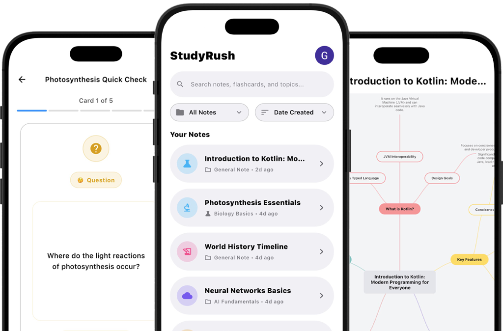 Explore exactly how StudyRush takes source material and turns it into lesson summaries, flashcards, quizzes, and mind maps.